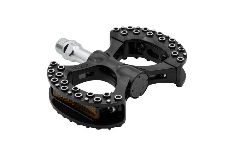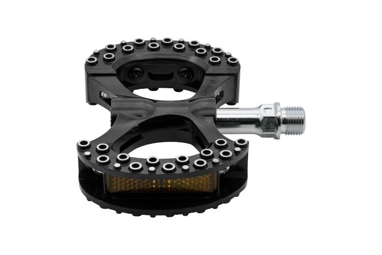 The Lambda is an extremely unique double-sided platform pedal designed in conjunction with Rivendell Bicycle Works. The Lambda design uses a somewhat traditionally alloy pedal body attached to very unconventional alloy step block, and is built around our hand adjusted cup and cone bearing system. The large “C” shaped step blocks feature a octopus sucker like dimple that provides excellent grip without shoe damaging pins. While this pedal is quite large front to back, the unique design isn’t particularly wide allowing for ample clearance while cornering. Due to the large surface area, this pedal is popular for cycling in boots and fat biking.