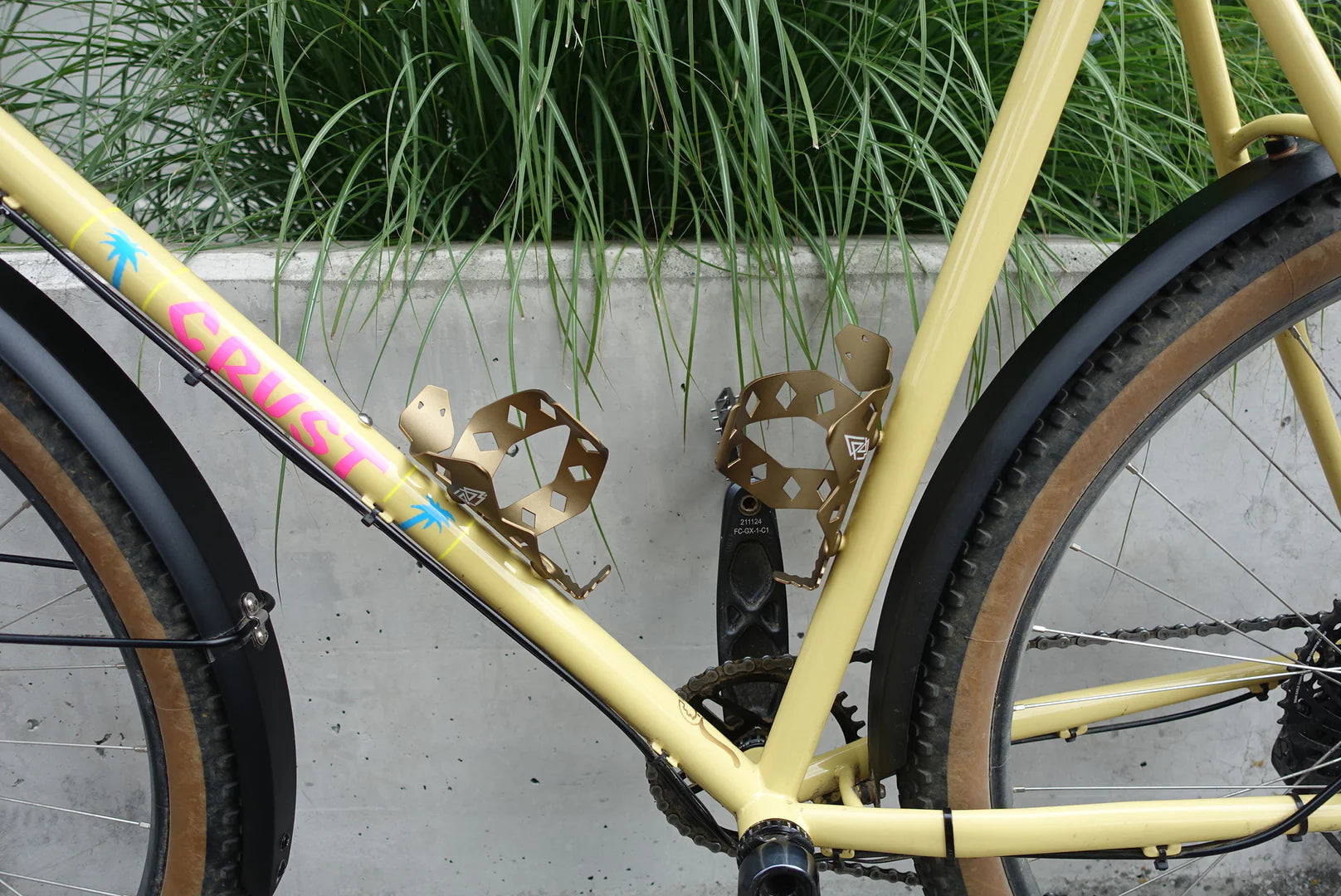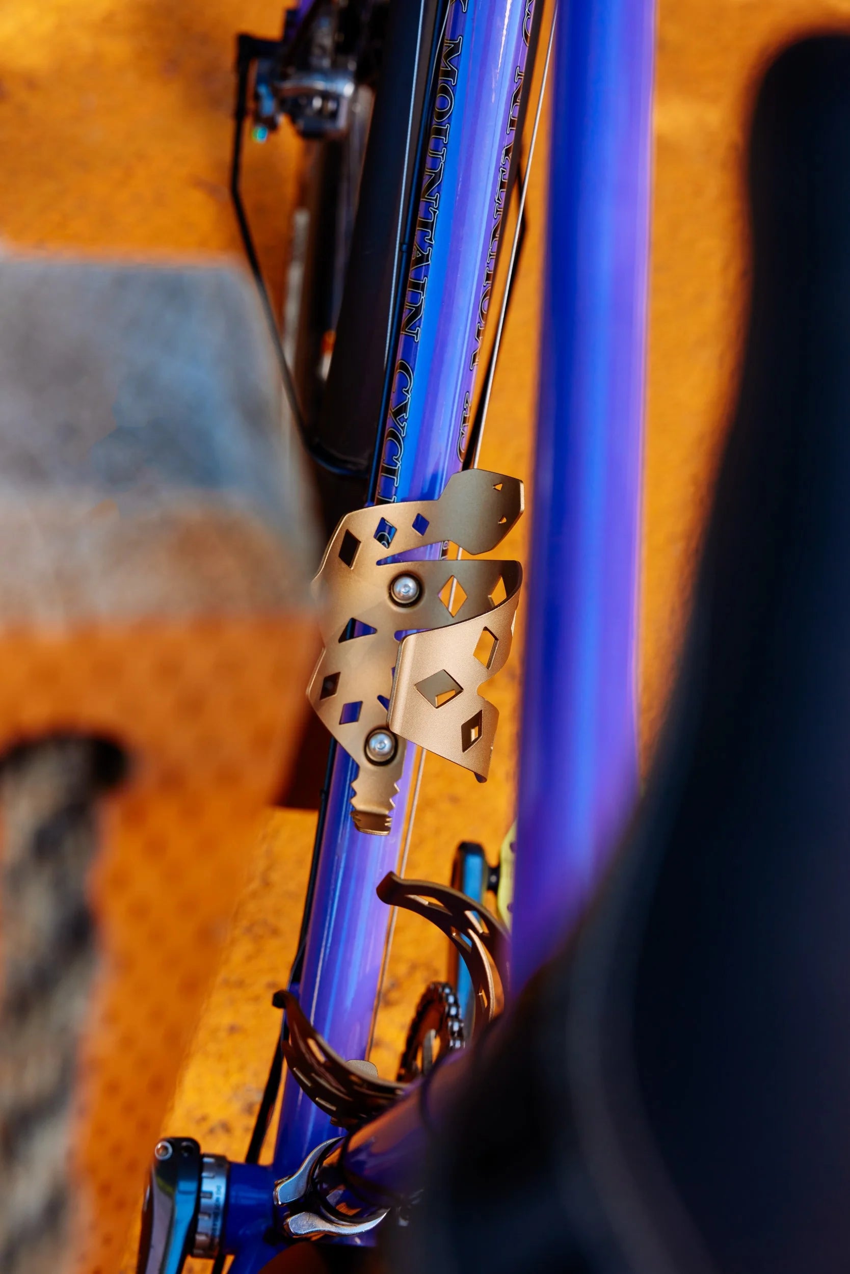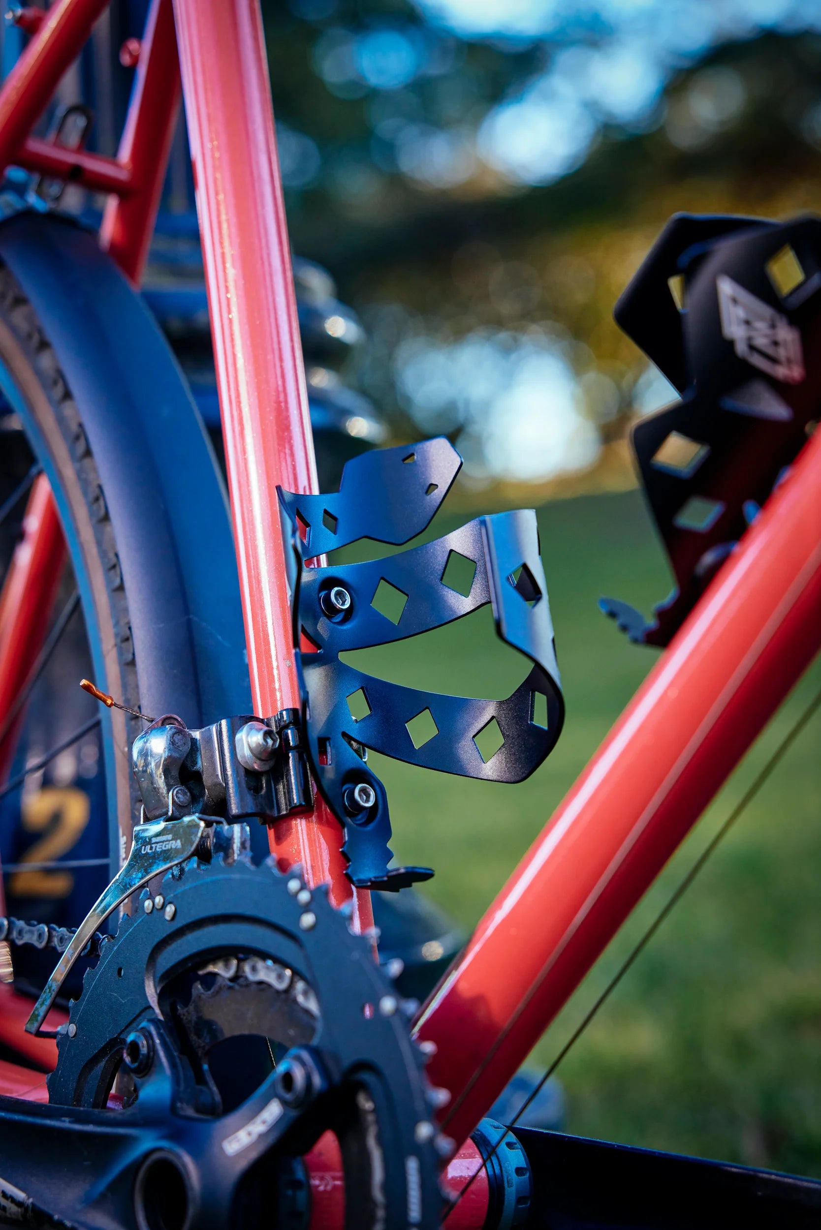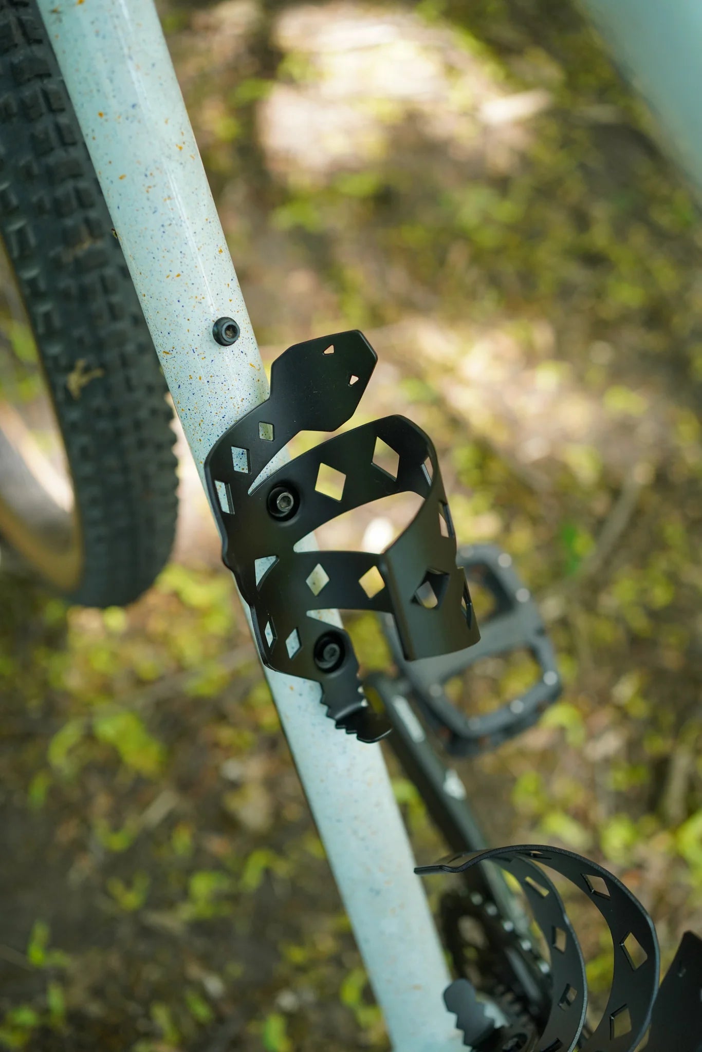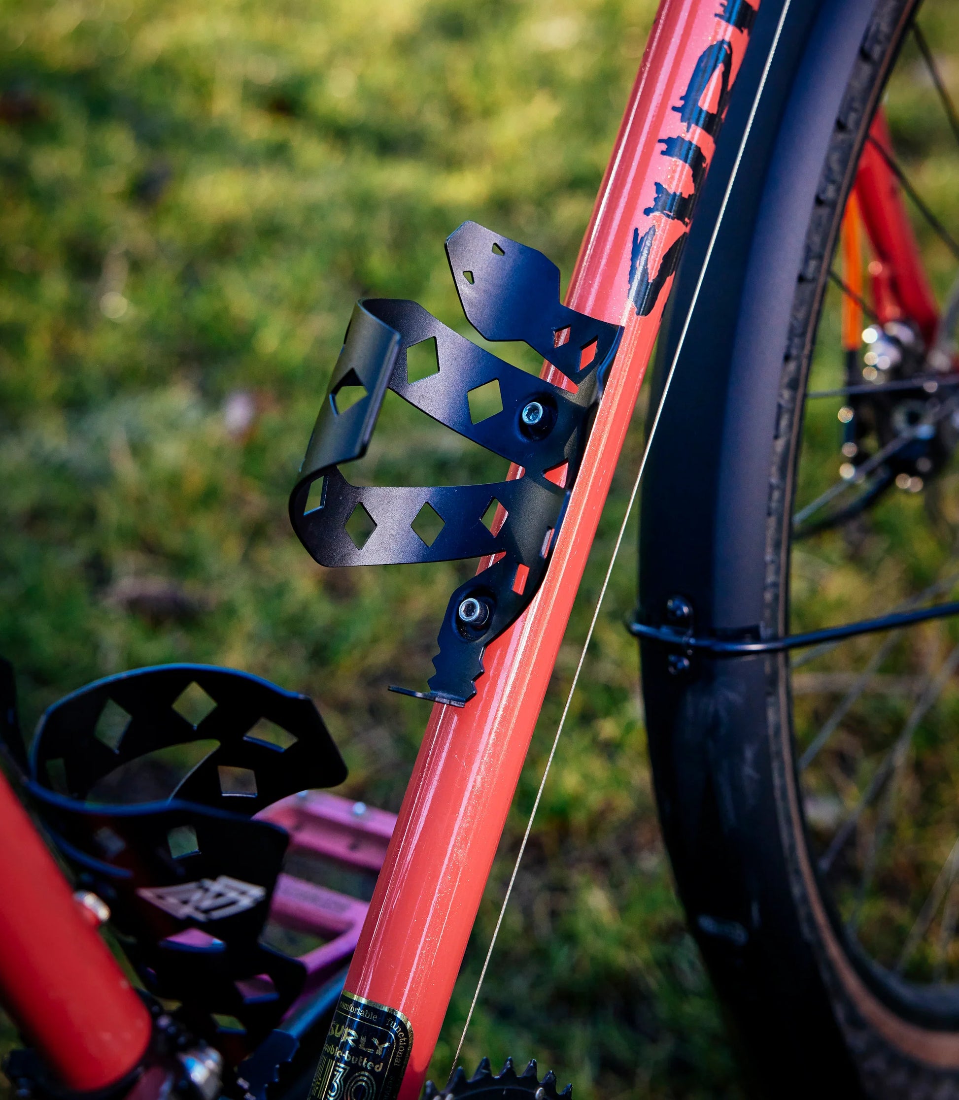 The Rattlesnek Kej is made from a single sheet of lightweight 5052 alloy. Its sinuous body puts the squeeze on your water bottle while diamond cutouts make this cage nice and light. The side entry design works well for all frame sizes, and because the Rattlesnek Kej is available with the opening on either the left or right, you can access bottles from the same side of your bike when you have Rattlesneks mounted on both your downtube and seat tube.